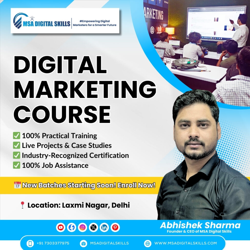 MSA Digital Skills Digital Marketing Institute offers a comprehensive demo class designed to provide an immersive experience into the world of digital marketing. During the demo class, participants will get an overview of key digital marketing concepts such as SEO, social media marketing, PPC advertising, and email marketing. The session includes practical exercises, hands-on activities, and insights into current industry trends, guided by expert trainers like Abhishek Sharma and Jyotish Kumar. This interactive class aims to give prospective students a taste of the institute’s teaching methodology and the practical skills they will acquire during the full course. For more details, visit their [official website](https://msadigitalskills.com).
